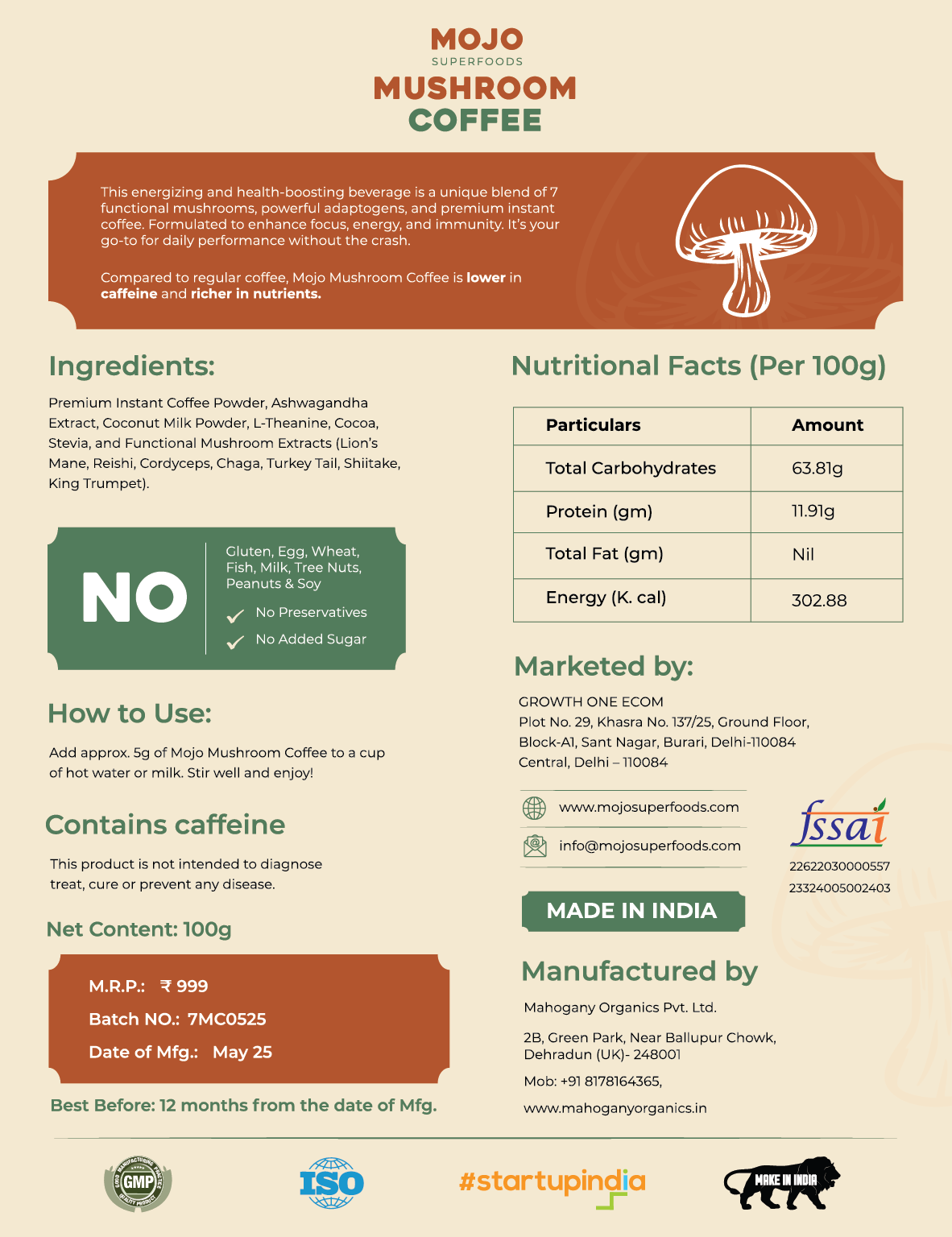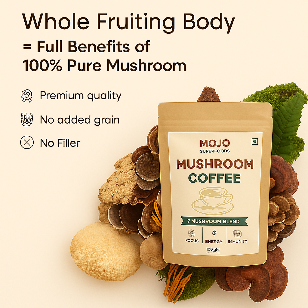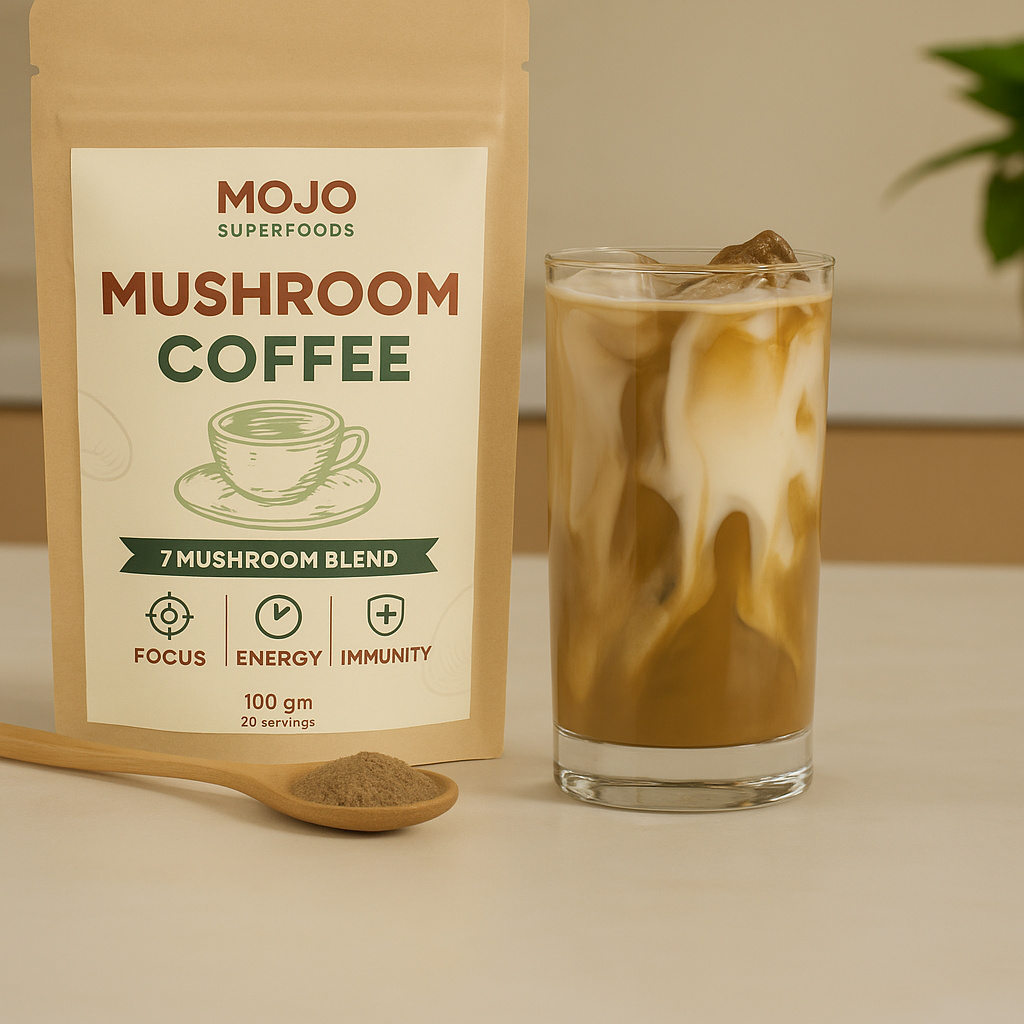 Power up your mornings with Mojo Mushroom Coffee, India’s first 7-mushroom adaptogenic coffee blend.