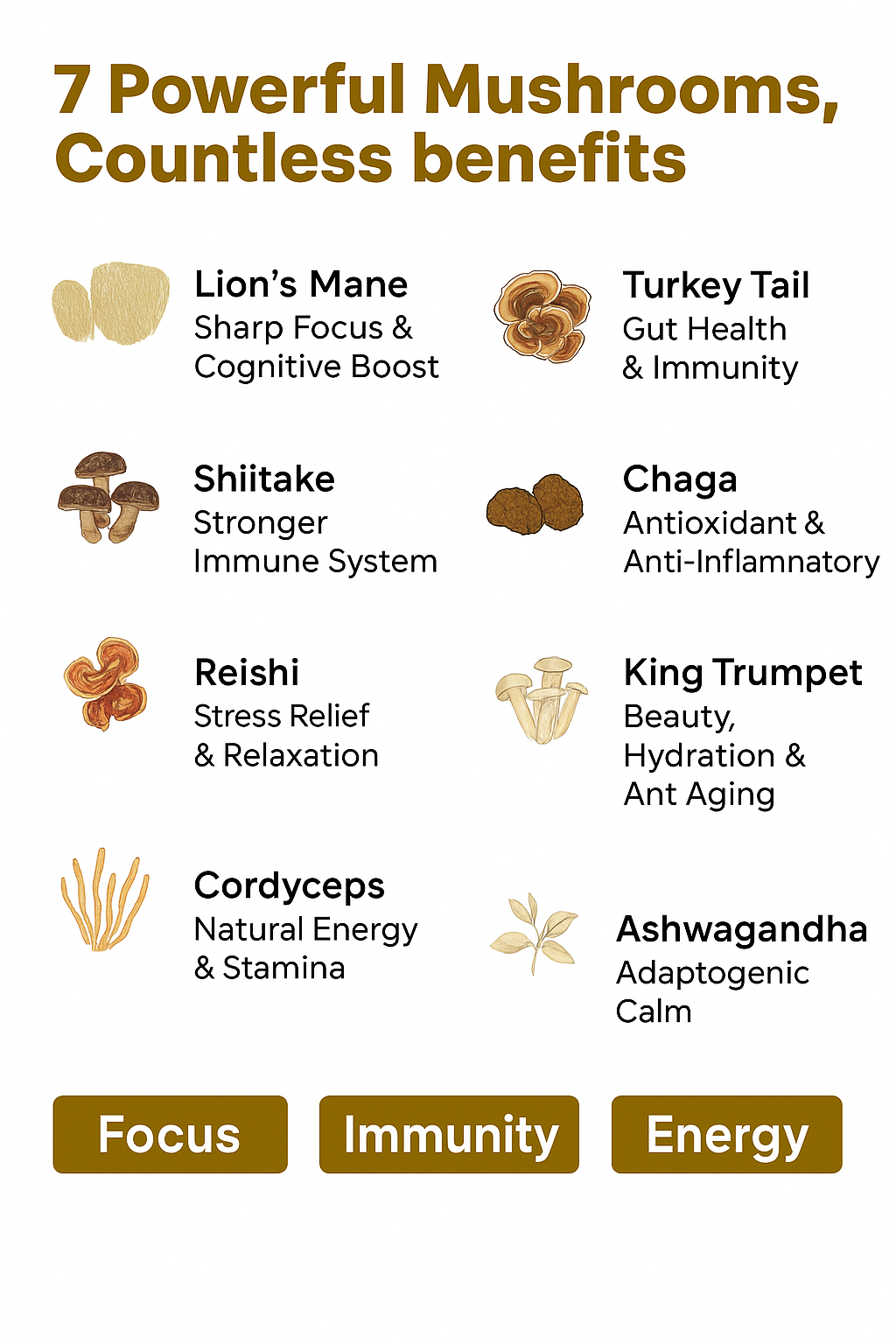 - Lion’s Mane, Cordyceps, Reishi, Turkey Tail, Chaga, Shiitake, King Trumpet – for focus, energy & immunity